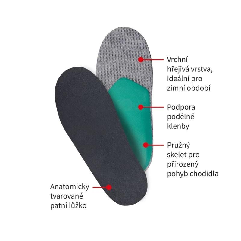Teplé ortopedické vložky pro podporu podélné klenby. Napomáhají vyrovnávat chodidla do správného postavení, změkčují došlap a udržují nohy v teple.