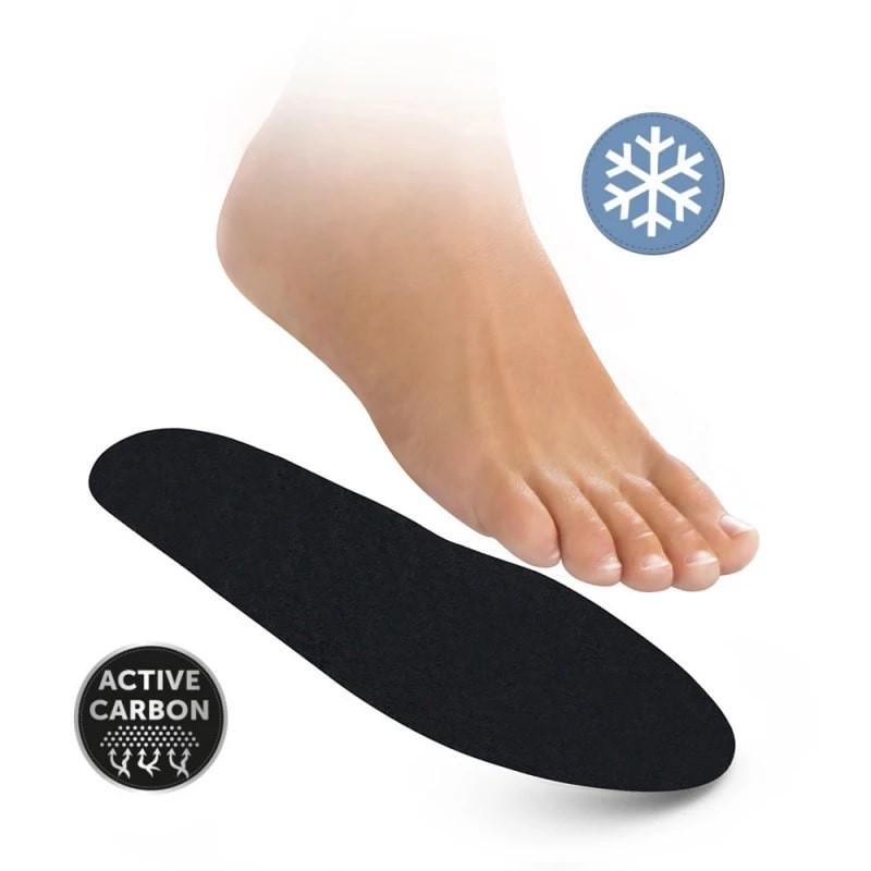 Vrchní latexová stélka s obsahem aktivního uhlíku vyniká vysokou savostí a omezuje šíření nežádoucích bakterií. Povrch stélky je zateplen 100% česanou polyesterovou tkaninou, která výborně hřeje. Tvar lze upravit zastřižením nůžkami ve špičce.