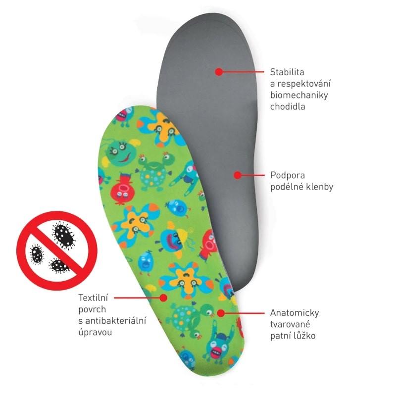 Dětská noha je ve svém vývoji ohrožena mnoha negativními vlivy (nevhodná obuv, nedostatečný pohyb, nadměrná tělesná námaha). Ortopedická vložka pomáhá vyrovnat dolní končetiny do správného osového postavení. Podepírá podélnou klenbu a zajišťuje stabilitu uložením paty do anatomicky tvarovaného lůžka.