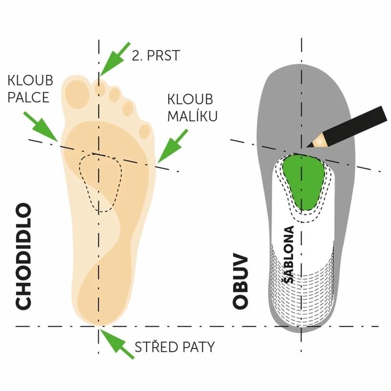 Vrchol srdíčka by měl ležet těsně za klouby záprstních kostí (metatarsů) na průsečíku podélné a příčné osy, nepatrně posunutý k zevní straně. Tento vrchol leží na podélné ose přibližně v 67 % délky krycí stélky obuvi (měřeno od paty). Směr průběhu srdíčka má odpovídat přirozenému tvaru nohy. Pro jednodušší aplikaci lze využít šablonu, která je na rubu příbalového letáku.