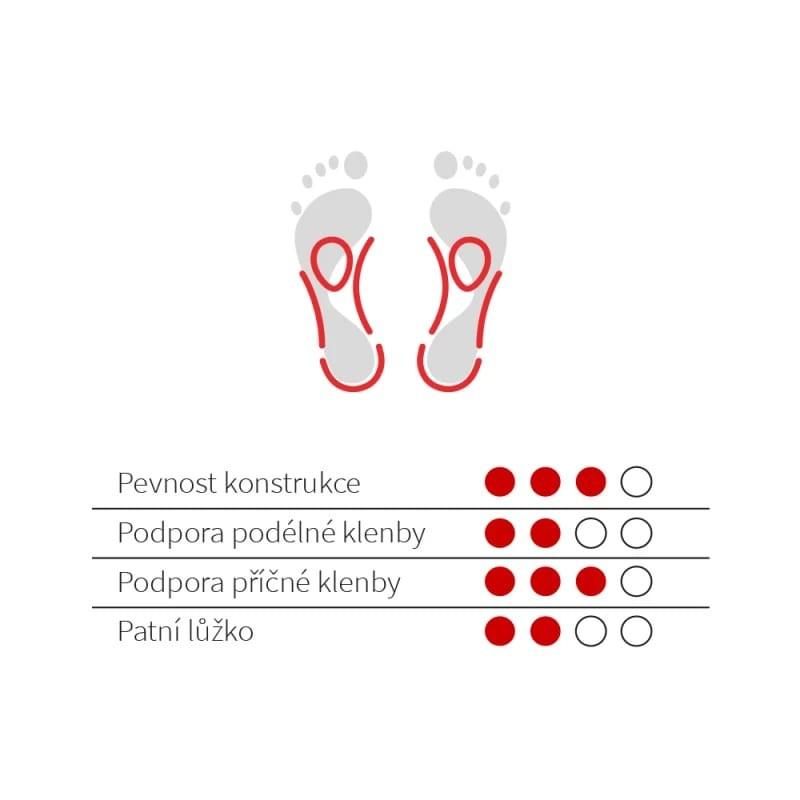 | Instrukce k použití | Nepoužívejte současně s jinou podporou podélné a příčné klenby. / Po použití doporučujeme vložky vyjmout z obuvi a nechat proschnout při pokojové teplotě. Nesmí se prát v pračce. / Používejte správnou velikost. / V případě, že se léčíte s diabetem, konzultujte použití výrobku s lékařem. |
