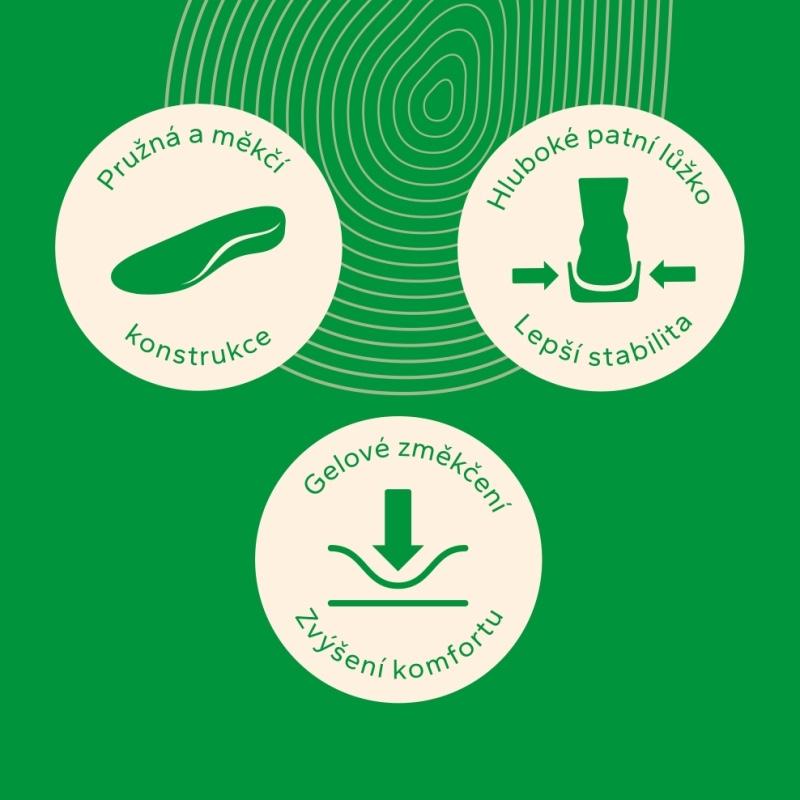 Podpora klenby a stability – měkčí ortopedická konstrukce s podélnou klenbou a hlubokým patním lůžkem fixuje chodidlo ve správné poloze.