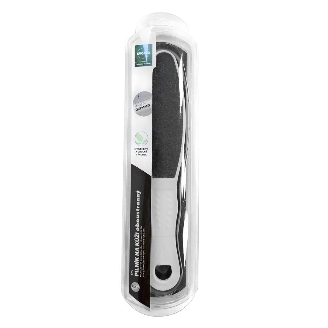Hrubý povrch pro odstranění zrohovatělé kůže, jemný brusný povrch pro následné vyhlazení.