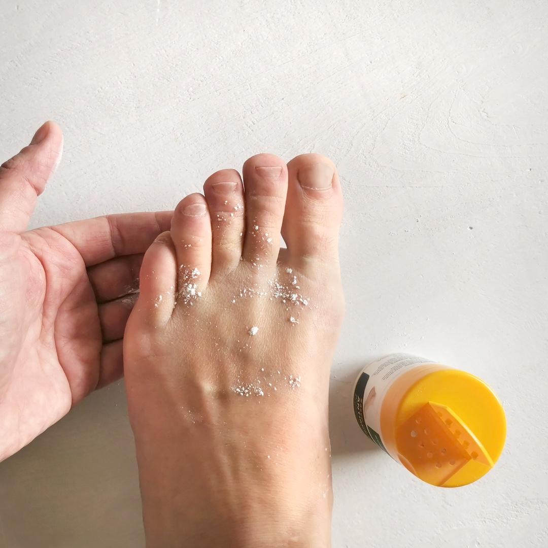 Zásyp na nohy s účinnou látkou JMAC (Silver Chloride, Titanium Dioxide), která má výrazné protiplísňové účinky a omezuje zápach nohou.