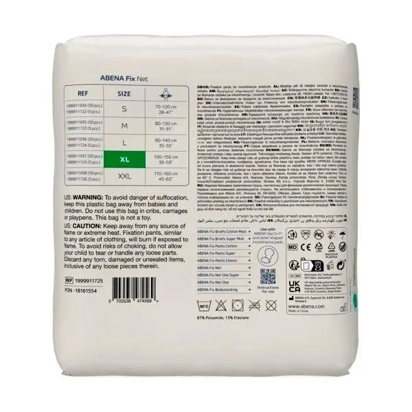 Abena Fix Net jsou pružné tenké síťované fixační kalhotky s dokonalou elasticitou pro zajištění vložných plen typu ABRI SAN. Kalhotky mají vytvořené horizontální stabilizační zóny, které jsou ideální pro bezpečné uchycení vložných plen na místě. I přes lehkou konstrukci se jedná o odolné síťované provedení.