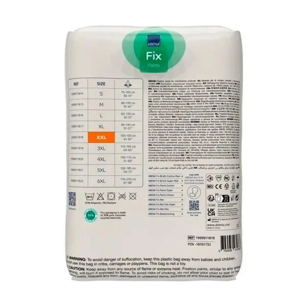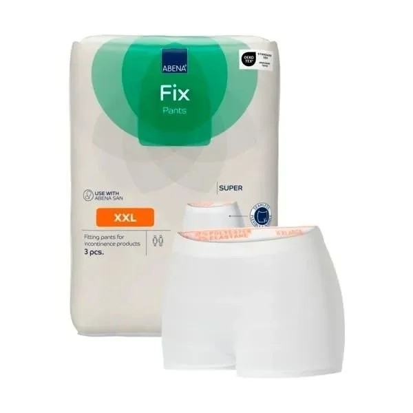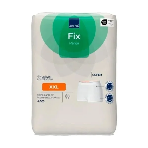 Abena Fix Pants Super je řada pružných fixačních kalhotek s nohavičkami, které mají zesílenou strukturu, čímž poskytují ještě vyšší úroveň podpory a fixace. Kalhotky také disponují velmi dobrou elasticitou a přilnavostí, které minimalizuje riziko posunutí plen během nošení. Speciální bezešvá pletená technologie zabraňuje vzniku otlačení a podráždění kůže.