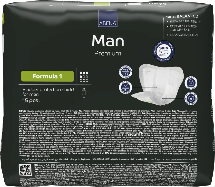 Abena Man Premium Formula 1 jsou absorpční vložky, speciálně navržené pro mužskou anatomii, které zajišťují vynikající komfort a bezpečnost. Jejich tvar je pečlivě přizpůsoben mužskému tělu, což zaručuje pohodlné nošení bez jakéhokoli obtěžování. Díky komfortním podélným bariérám ve tvaru kapsy se vložky dokonale přizpůsobí tělu a zajistí spolehlivou ochranu před únikem moči.