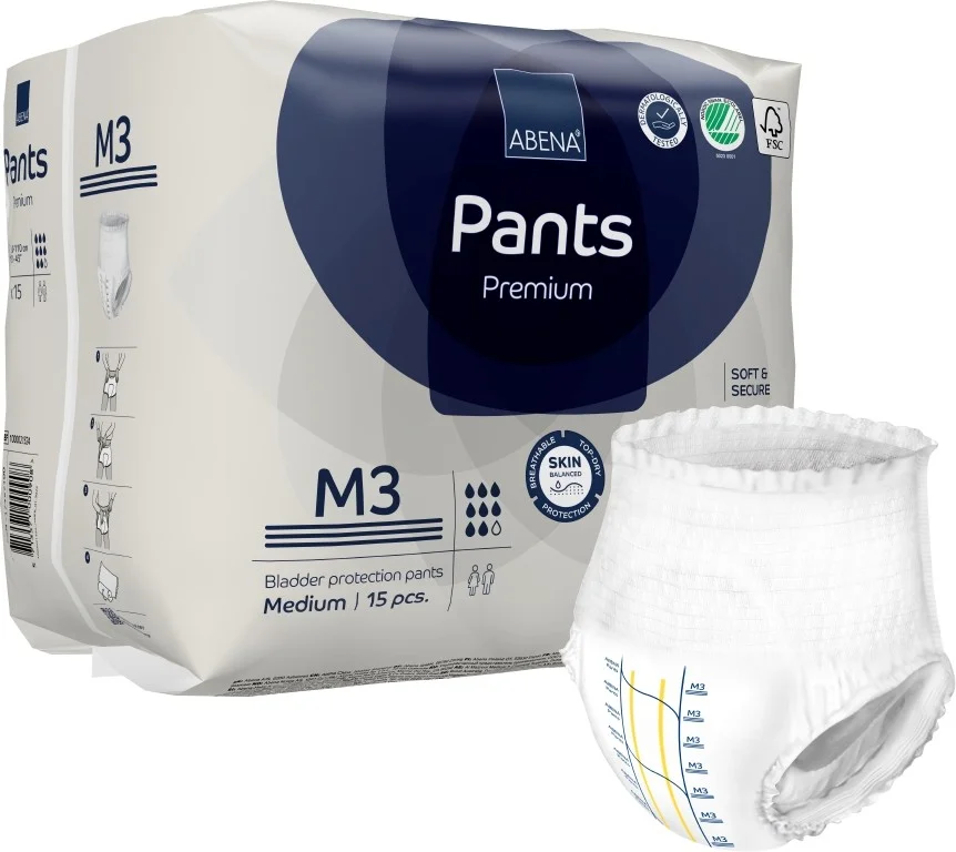 ABENA PANTS je prémiová řada jednorázových navlékacích kalhotek v široké nabídce velikostí a absorpce, které lze nosit jako běžné spodní prádlo.