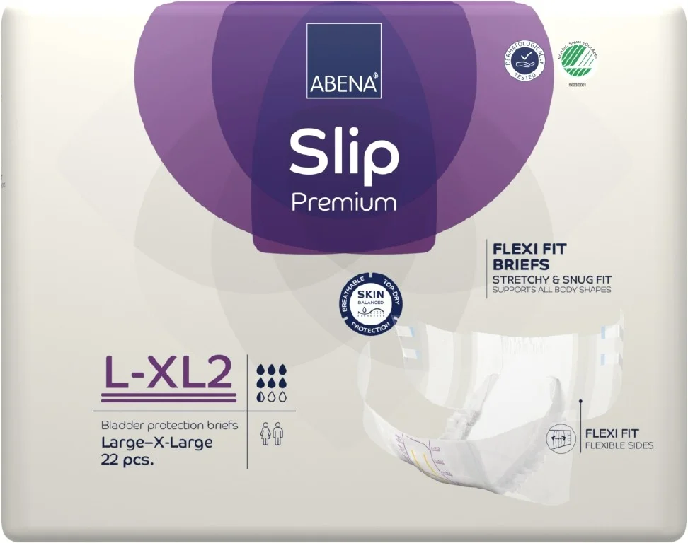 Abena Slip Flexi Fit Premium je modernizovaná řada absorpčních zalepovacích plenkových kalhotek řady SLIP s vestavěnými pružnými bariérami na bocích a vylepšenou technologií lepicích pásků.