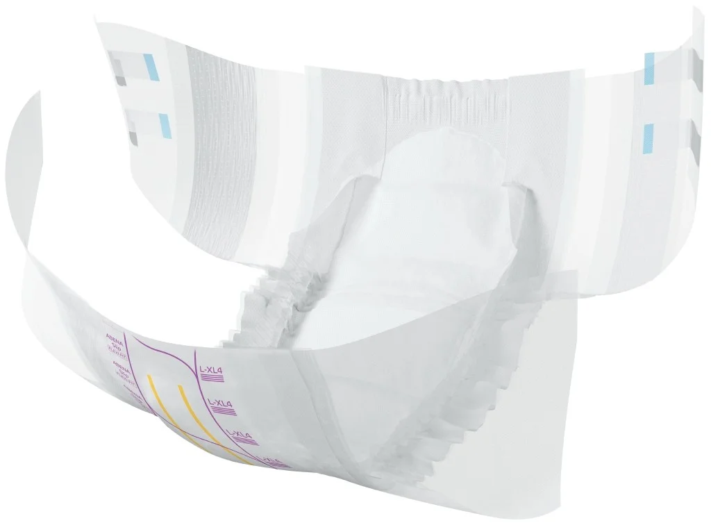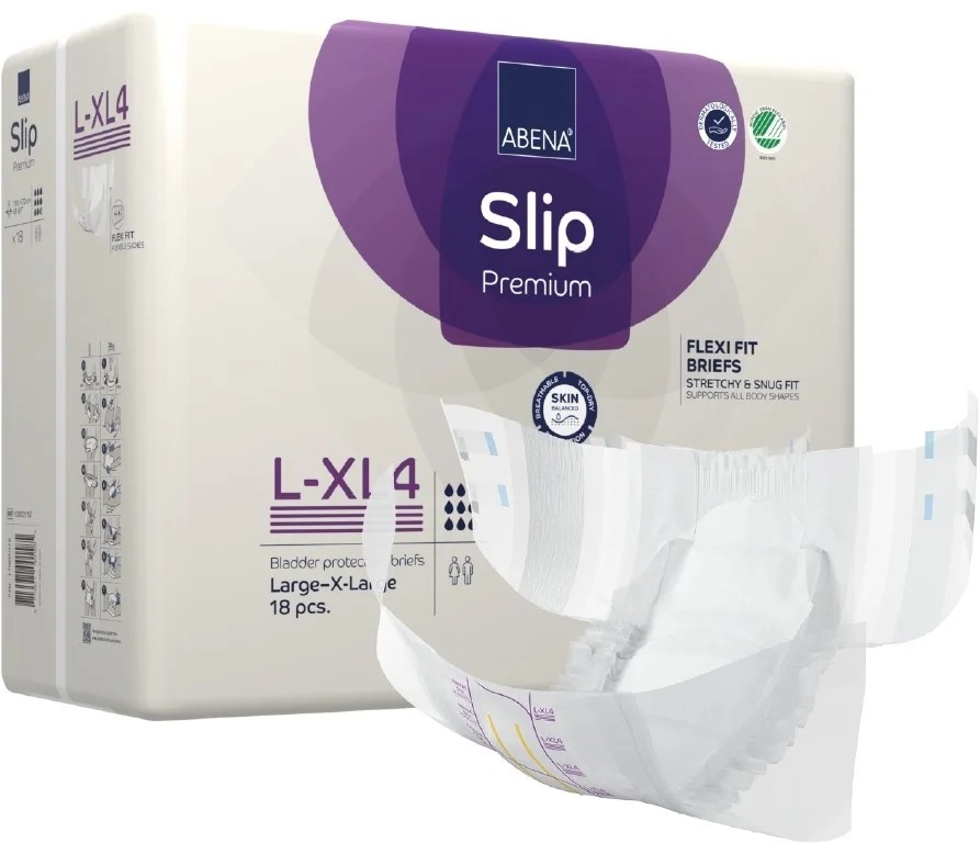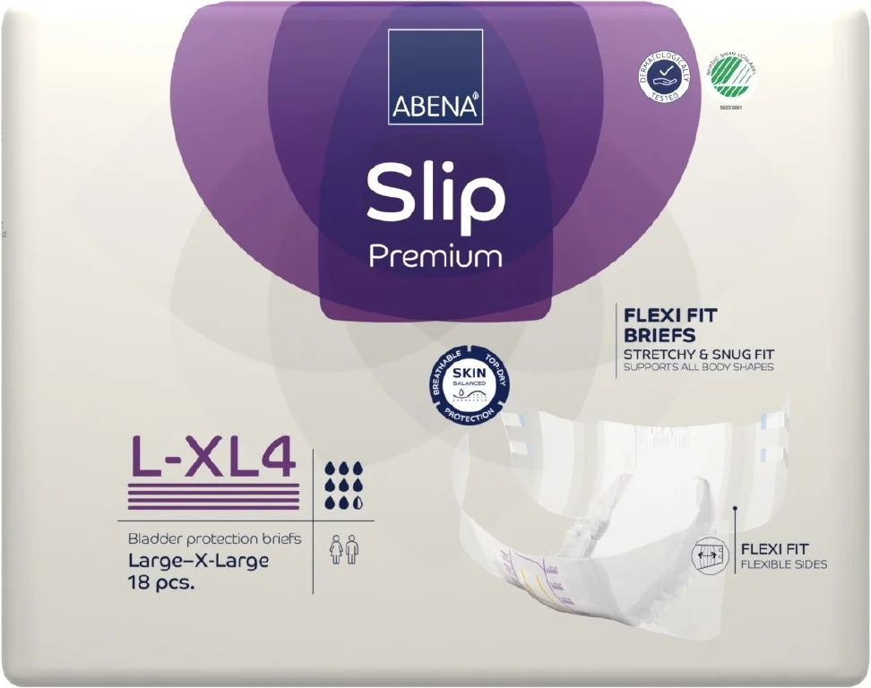 Abena Slip Flexi Fit Premium je modernizovaná řada absorpčních zalepovacích plenkových kalhotek řady SLIP s vestavěnými pružnými bariérami na bocích a vylepšenou technologií lepicích pásků.