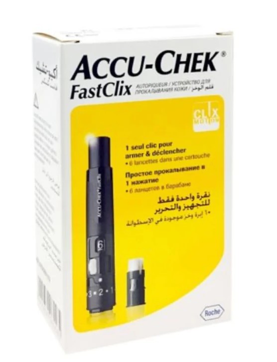 Accu-Chek Fastclix je odběrový systém se zabudovaným systémem výměny lancet. V lancetové bubínku je umístěno šest lancet.