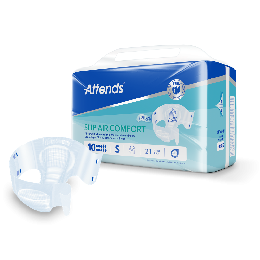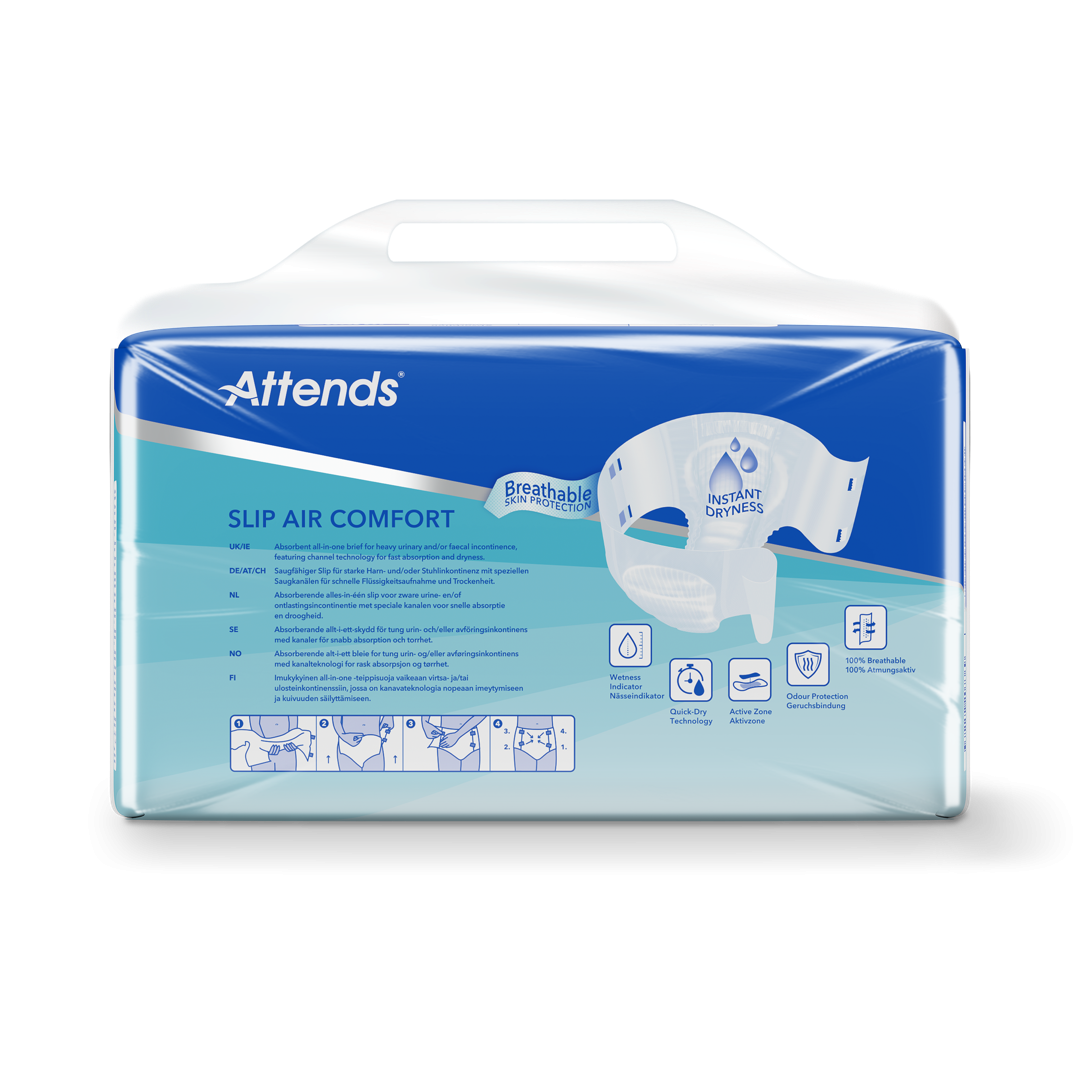 Attends Slip Air Comfort jsou absorpční kalhotky typu „all‑in‑one“ s technologií kanálků pro rychlou absorpci a suchost. Jsou určeny ke zvládání těžké inkontinence moči a/anebo stolice.