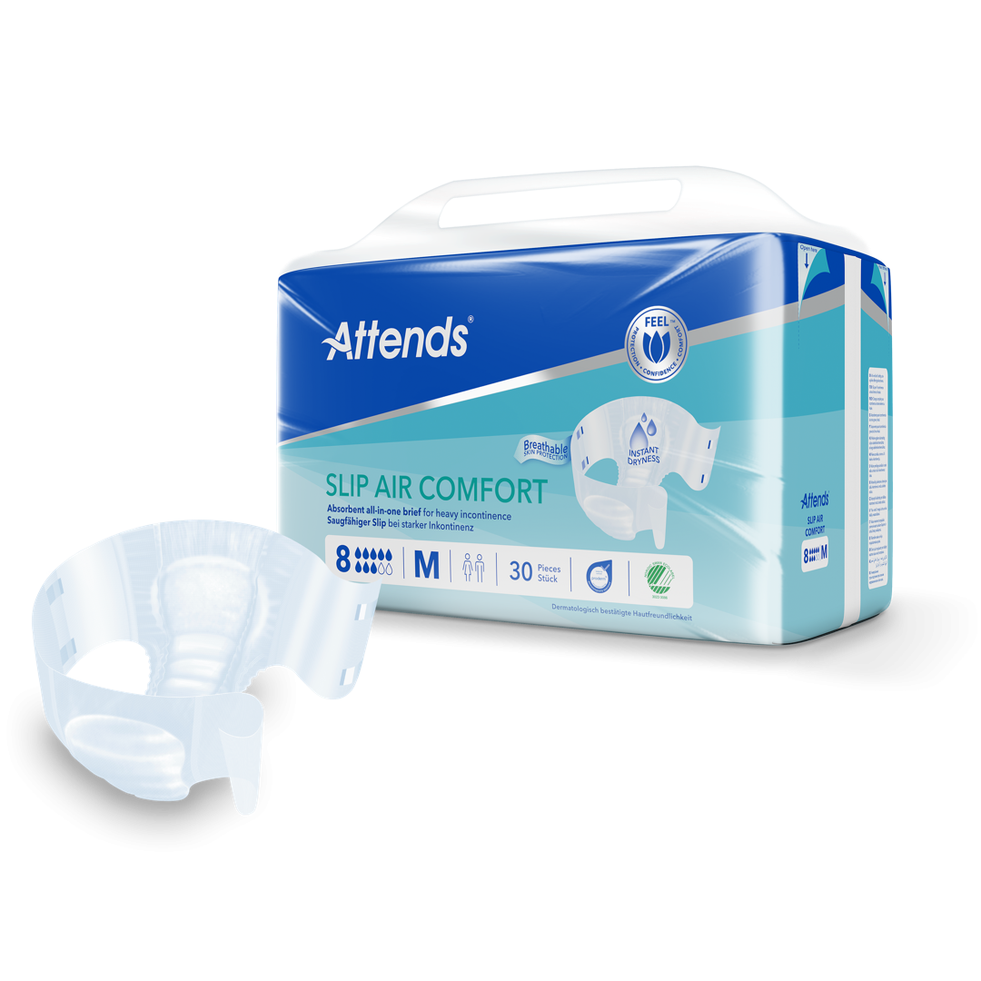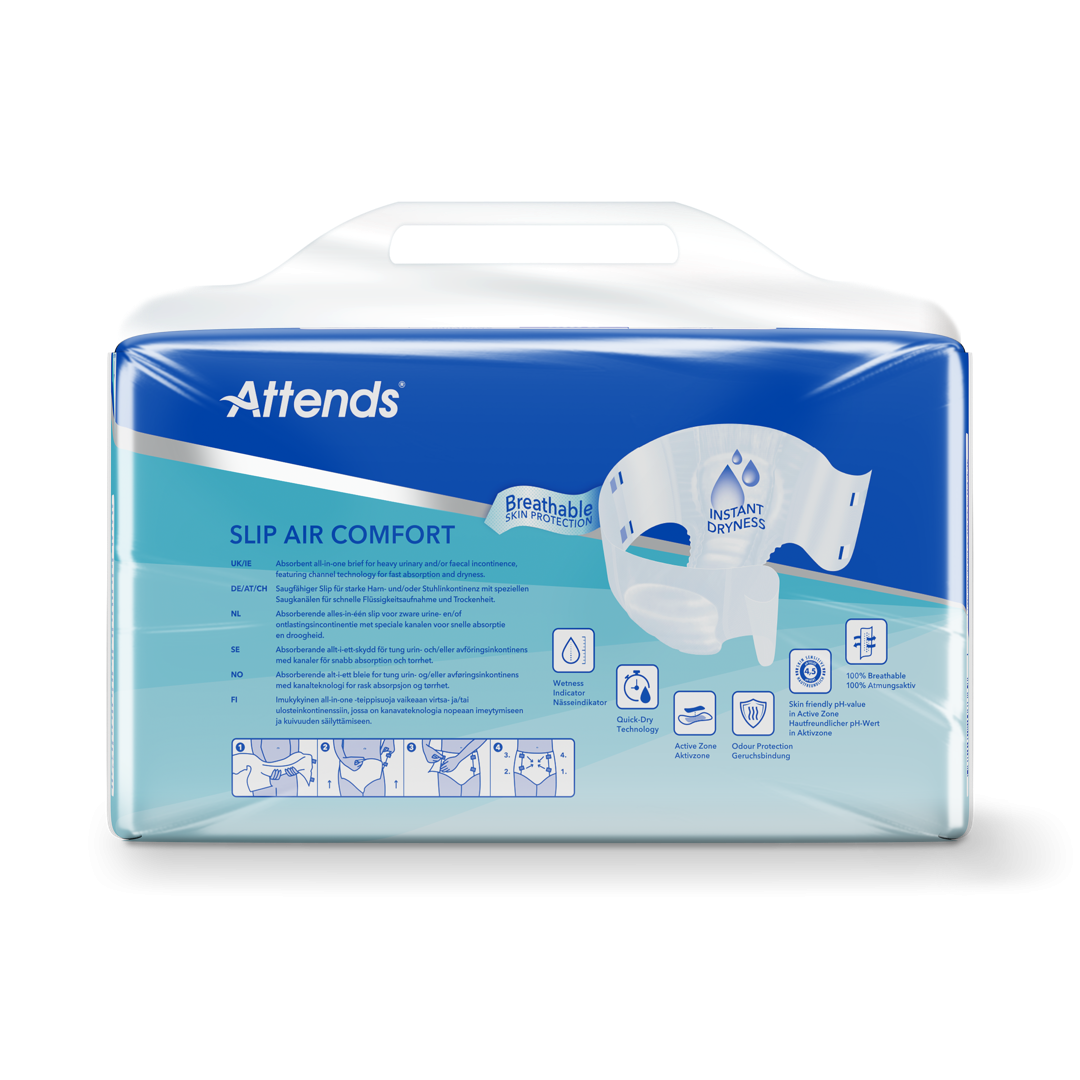 Attends Slip Air Comfort jsou absorpční kalhotky typu „all‑in‑one“ s technologií kanálků pro rychlou absorpci a suchost. Jsou určeny ke zvládání těžké inkontinence moči a/anebo stolice.
