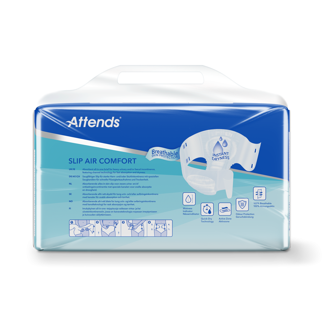 Attends Slip Air Comfort jsou absorpční kalhotky typu „all‑in‑one“ s technologií kanálků pro rychlou absorpci a suchost. Jsou určeny ke zvládání těžké inkontinence moči a/anebo stolice.