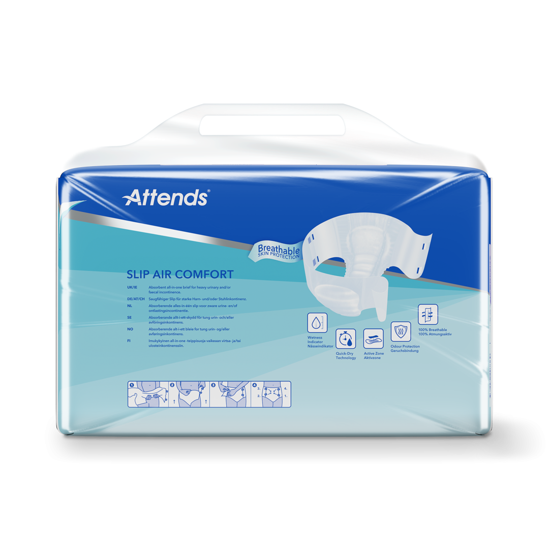 Attends Slip Air Comfort jsou absorpční kalhotky typu „all‑in‑one“ s technologií kanálků pro rychlou absorpci a suchost. Jsou určeny ke zvládání těžké inkontinence moči a/anebo stolice.