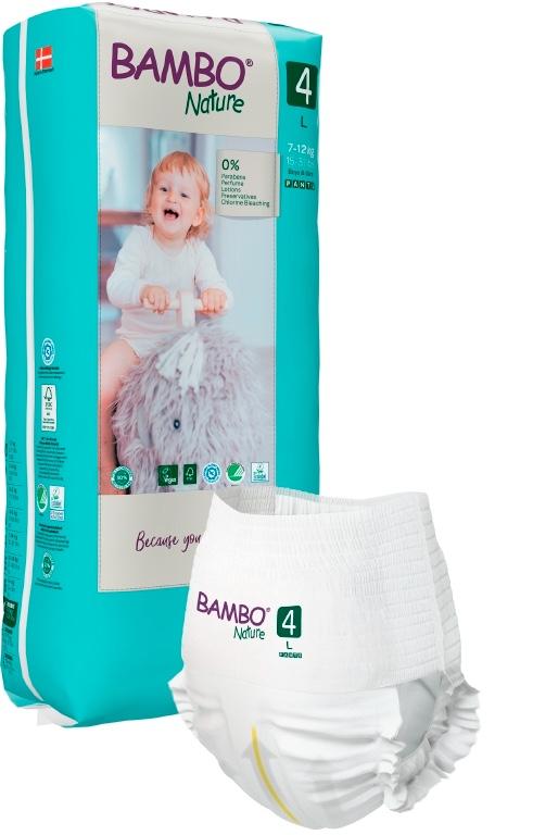 Bambo Nature Pants jsou nasazovací plenkové kalhotky, které byly navrženy ve spolupráci s rodiči tak, aby zajistili maximální pohodlí a nijak neomezovali pohyb dítěte. Bambo Nature Pants jsou k dispozici ve třech velikostech a jsou vhodné během tréninku na nočník.
