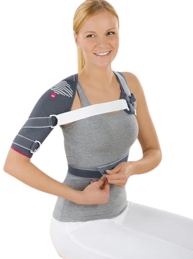 Bandáž ramene Omomed přináší omezení a prevenci škodlivých pohybů díky nastavitelné vyznačené limitaci zevní rotace, abdukce a anteflexe ramenního kloubu.