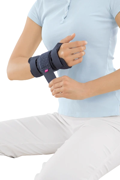 Zápěstní bandáž medi wrist support imobilizuje a stabilizuje zápěstí díky tvarovatelné hliníkové dlaze.