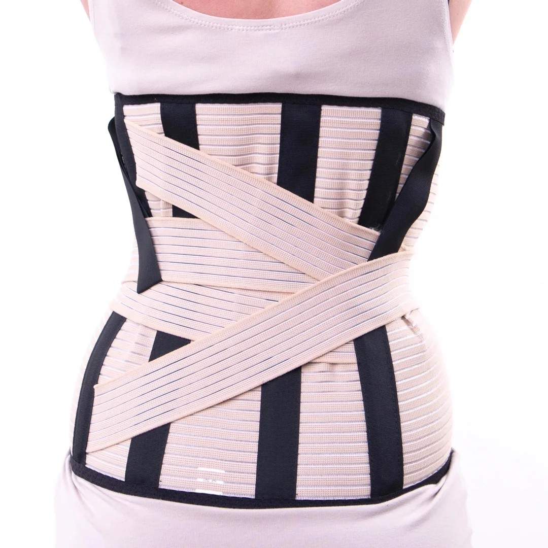 Bederní pás z prodyšného, elastického materiálu, který má čtyři plastové výztuhy s dvojitou křížovou fixací. Uchycení zajišťuje suchý zip.