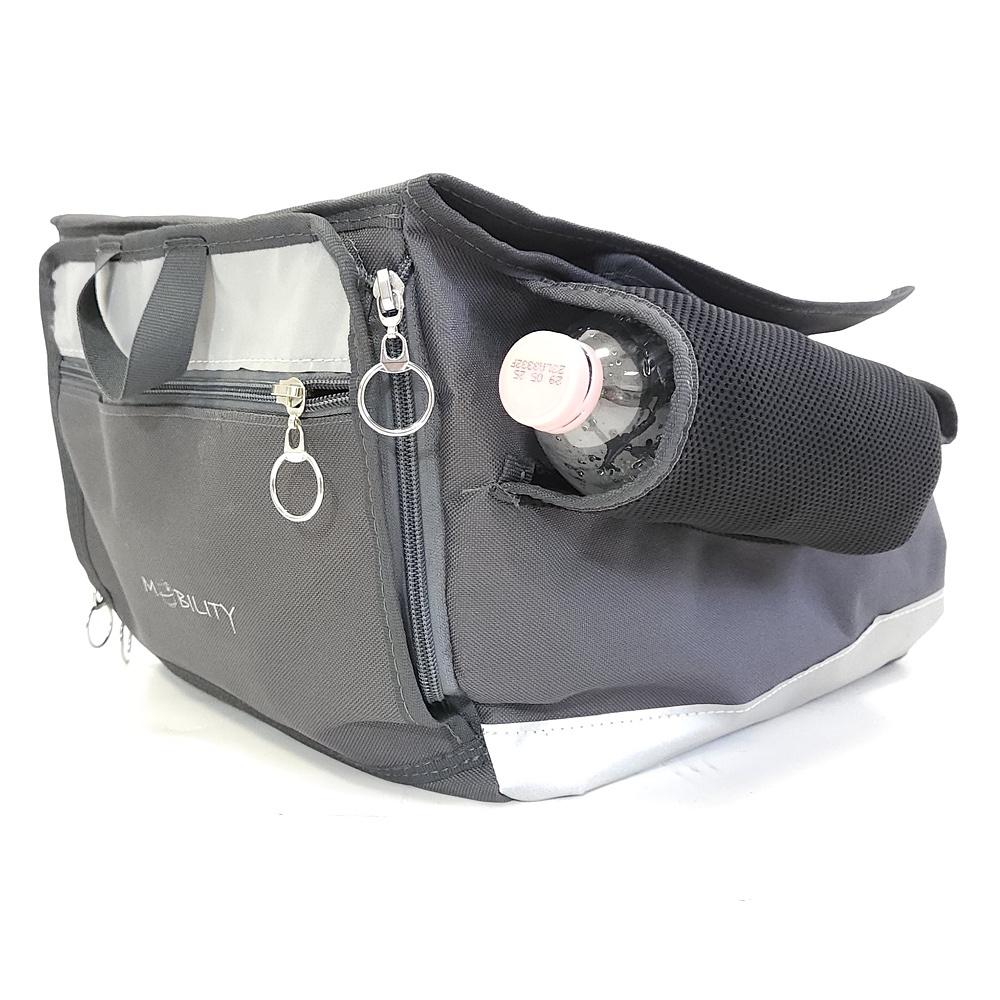 MOBILITY BAG je praktická přídavná kapsa k invalidním vozíkům, která nabízí čtyři samostatné oddělené přihrádky. Hlavní kapsa pojme oblečení či objemnější předměty, zatímco menší přední a boční kapsy slouží k bezpečnému a diskrétnímu uložení cenností nebo osobních hygienických potřeb. Součástí výbavy je také držák na láhev, plechovku nebo termosku s pitím.