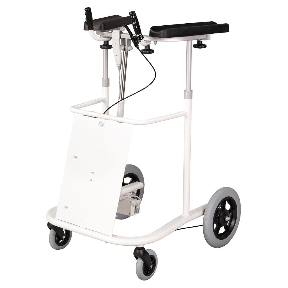 Chodítko 208 EL OUTDOOR je díky elektrickému zdvihu ideálním pomocníkem při vertikalizaci klienta, kterému pomáhá vstát. Díky velkým kolům, optimální stabilitě a centrální ruční brzdě je chodítko vhodné i pro venkovní použití.