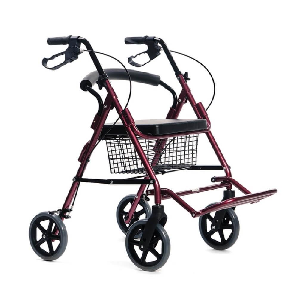 Čtyřkolové chodítko pro seniory a zdravotně postižené s odklopnou stupačkou.