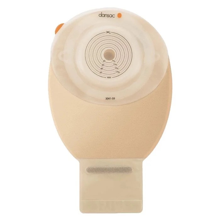 Výpustný ileostomický sáček Dansac NovaLife TRE 1 Open Convex s EasiView™ nahlížecím okénkem a oválnou konvexní lepicí plochou TRE. Hloubka konvexity je 6 mm.