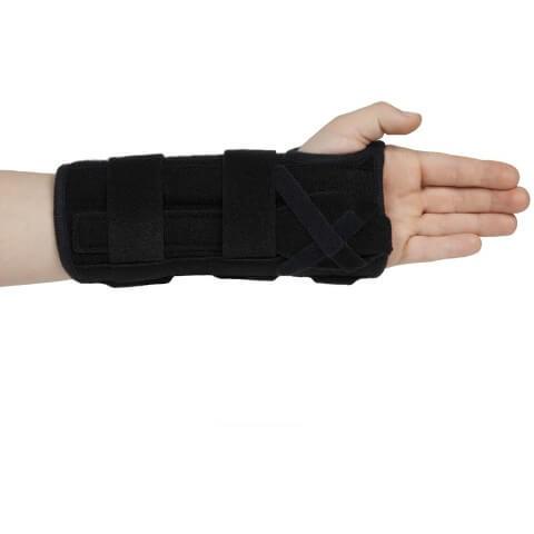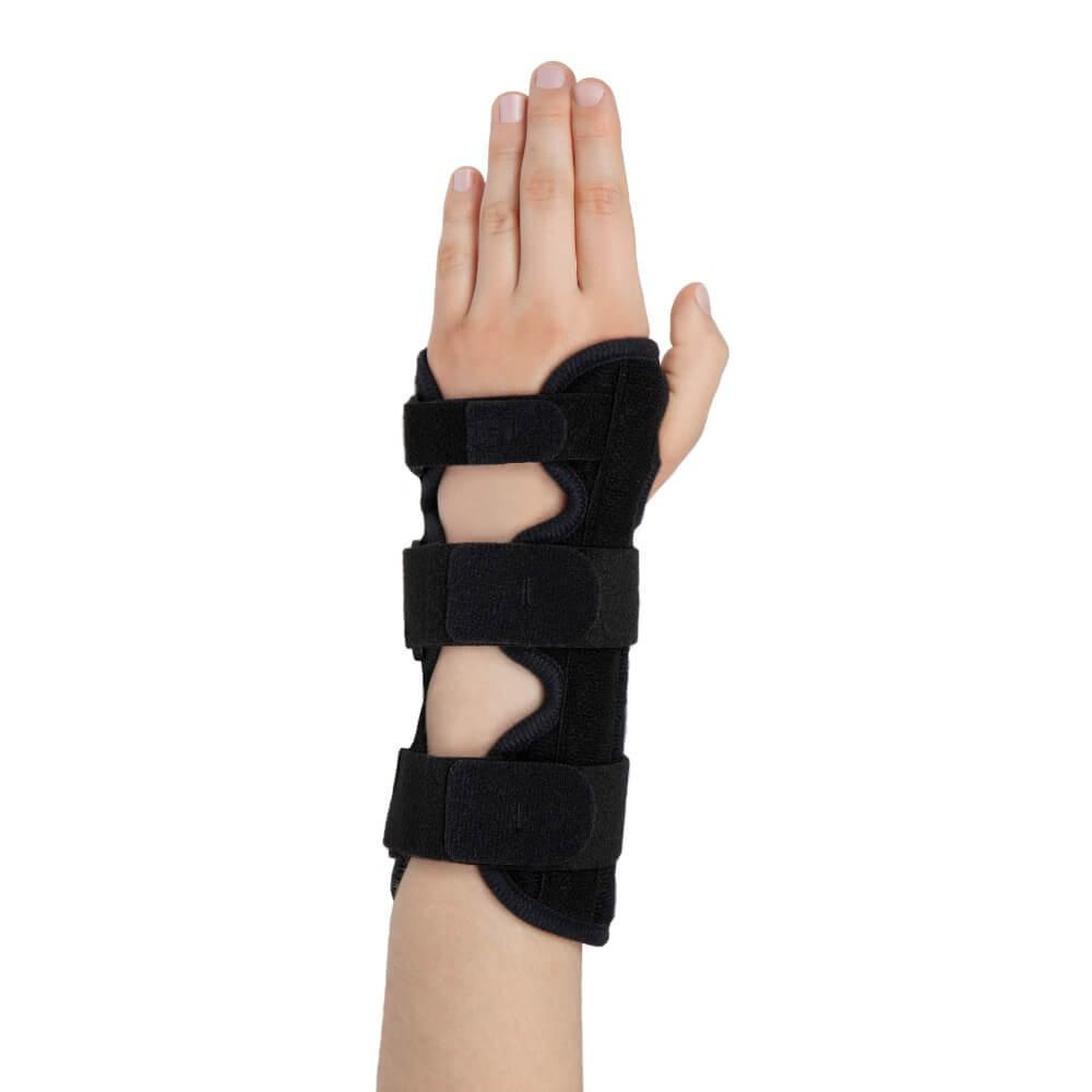 - Lehká ortéza zápěstí s volárně uloženou anatomicky profilovanou hliníkovou tvarovatelnou dlahou