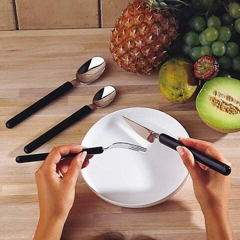 - Tato série ergonomických příborů je speciálně určena pro osoby, které si při jídle potřebují opřít ruce v předloktí o stůl.