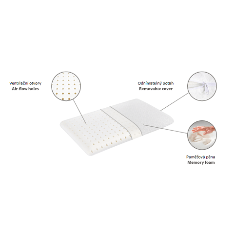 Pod vlivem tělesné teploty se paměťová pěna dokonale přizpůsobuje svému tvaru, čímž zvyšuje opěrný povrch. Polštář je vhodný pro alergiky díky paměťové pěně, která nepřispívá k růstu roztočů. Nízký obrys polštáře pomáhá udržovat hlavu, krk a páteř dítěte v jedné linii a ulevuje rostoucímu tělu.