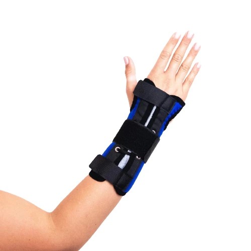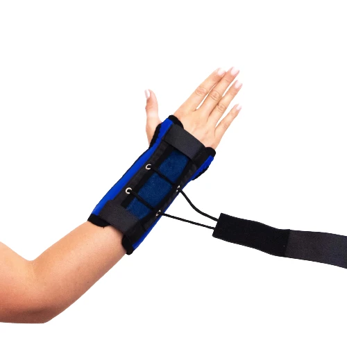 Fixace je tvořena kovovou pelotou, která se zapíná pomocí suchých zipů. Ve středové části je popruh pro snadnější fixaci zápěstí, Na vnitřní straně je froté materiál pro větší komfort při užívání.