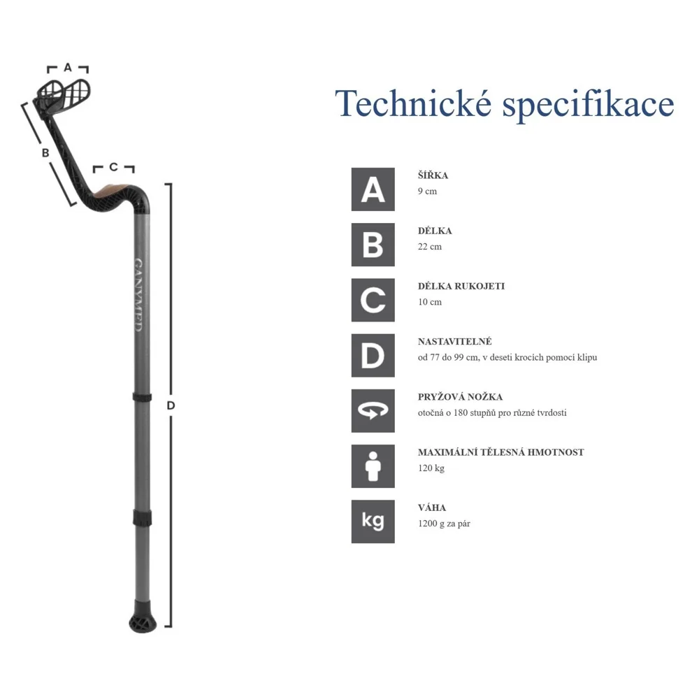 Díky umístění spodních opěrných trubek před rukojetí a posunutí těžiště je zajištěna správná ergonomie chůze a ideální vzpřímené držení těla. Předloketní horní část je ideálně ergonomicky úhlově i tvarově přizpůsobená anatomii horní končetiny, ideálně rozkládá hmotnost a odlehčuje tak kloubům. Při chůzi je tak na zápěstí vyvíjen menší tlak, čímž se výrazně eliminuje jeho opotřebení a výrazně snižuje riziko vzniku syndrou karpálního tunelu.