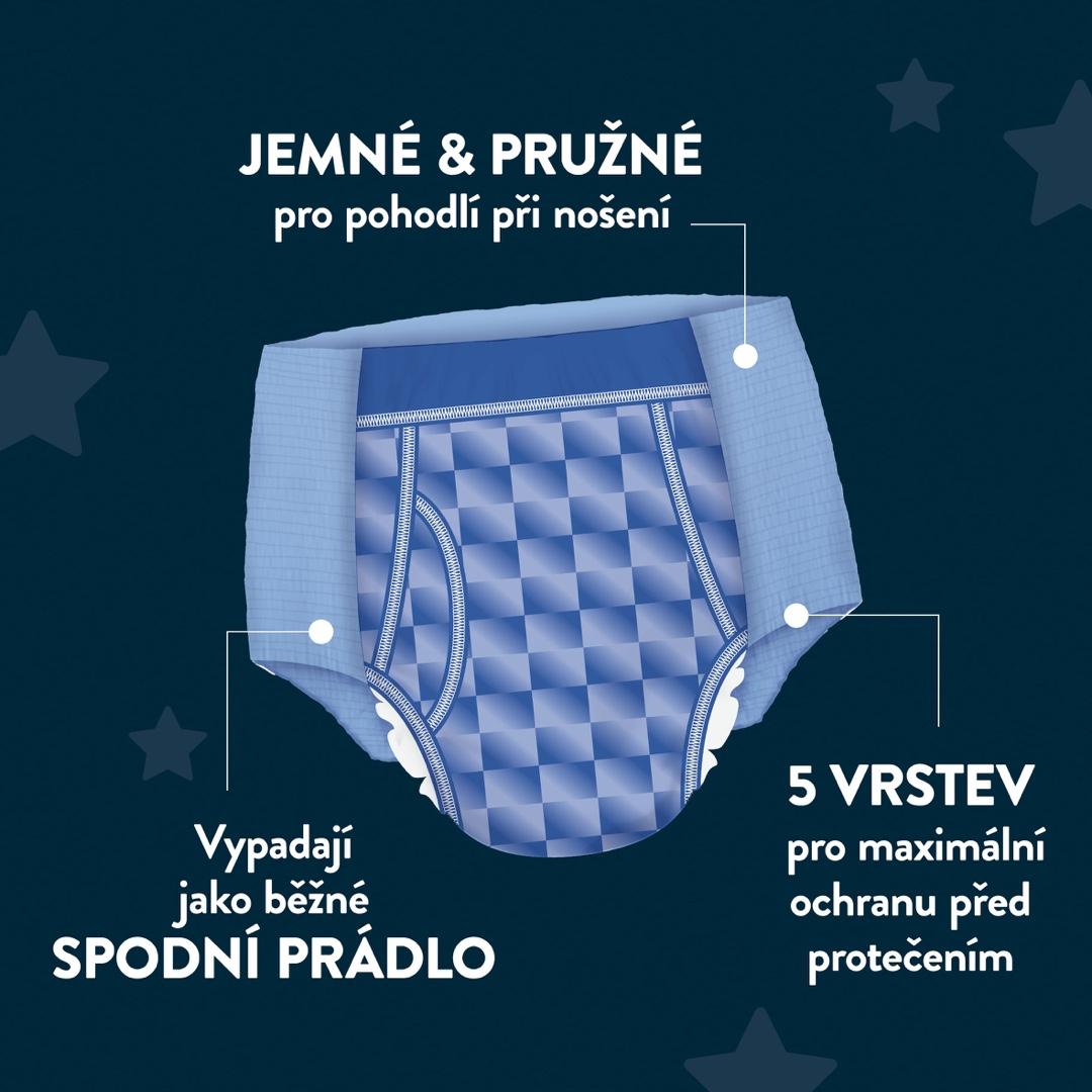DryNites® natahovací kalhotky na noc poskytují vašemu synovi spolehlivou ochranu při nočním pomočování, aby zůstal v suchu a mohl se dobře vyspat.