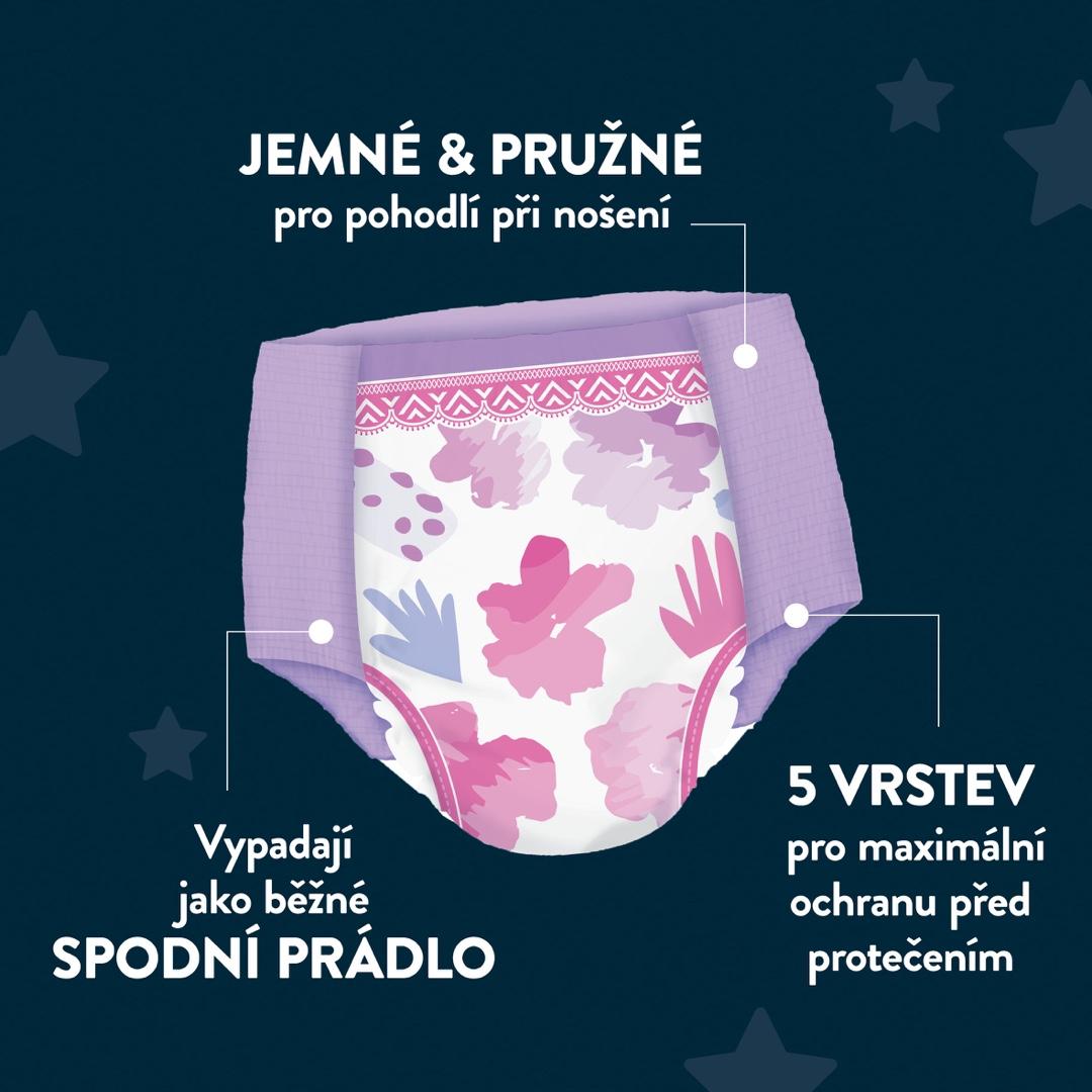 - Až 100 % nocí bez protečení – 5 vrstev zajišťuje maximální ochranu před únikem moči.