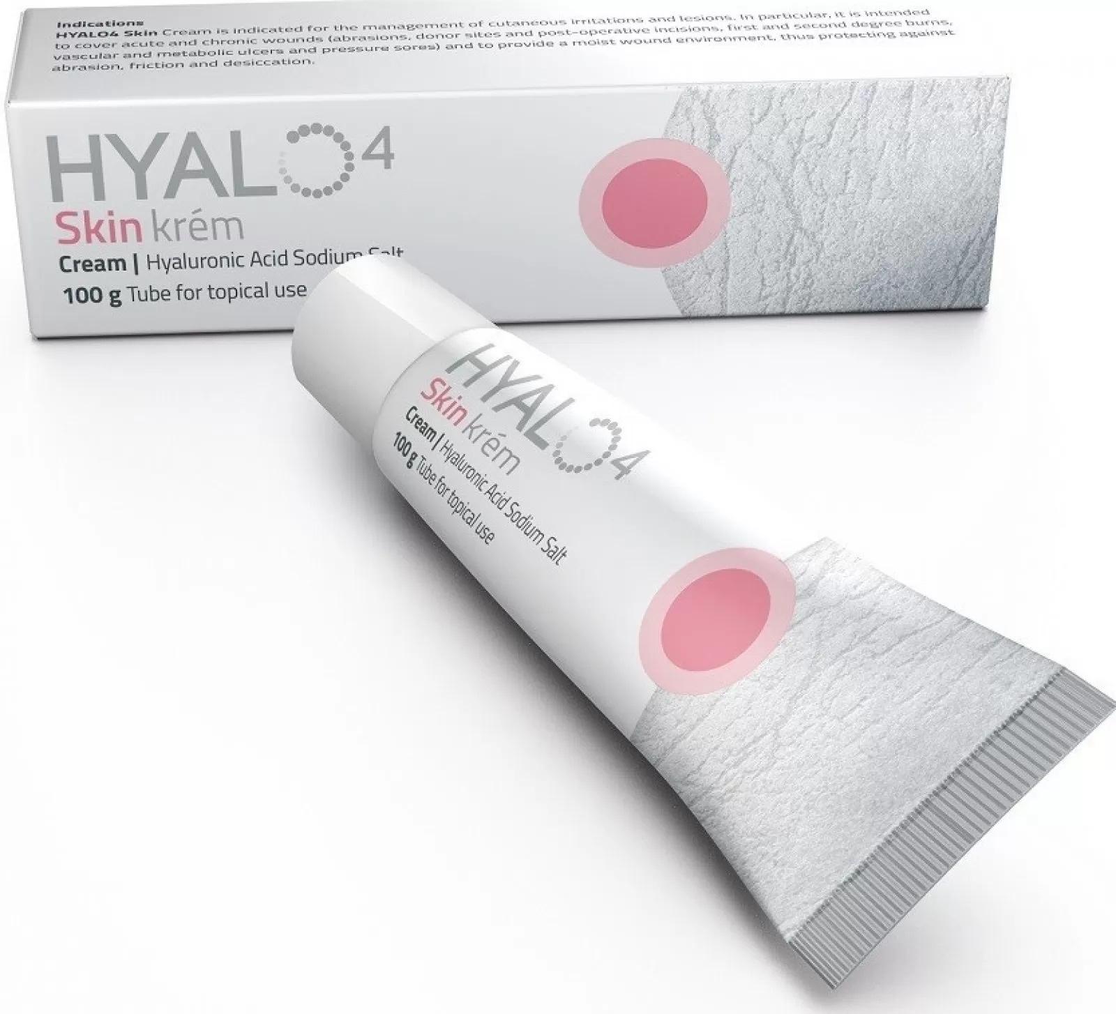 HYALO4 Skin krém je přípr. k lokálnímu použití, jehož hlavní složkou je kyselina hyaluronová. Díky svým hydrofilním vlastnostem vytváří hydratovaný prostor kolem buněk a mezi nimi a usnadňuje tak migraci buněk.Přípravek je určen k léčbě kožních poranění.