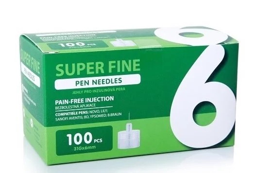Balení obsahuje 100 ks jehel o velikosti 31G x 6 mm.