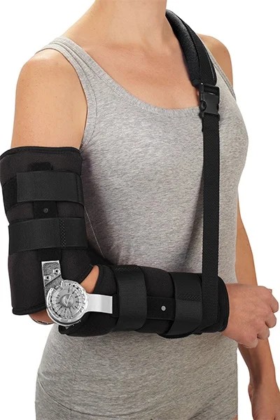 Kloubová loketní ortéza s jednoosým duralovým kloubem. Možnost nastavení flexe (0°–120°) a extenze (0°–120°) s limitací po 10°. Ortéza je dělená a umožňuje snadnou aplikaci. Součástí je ramenní závěs.