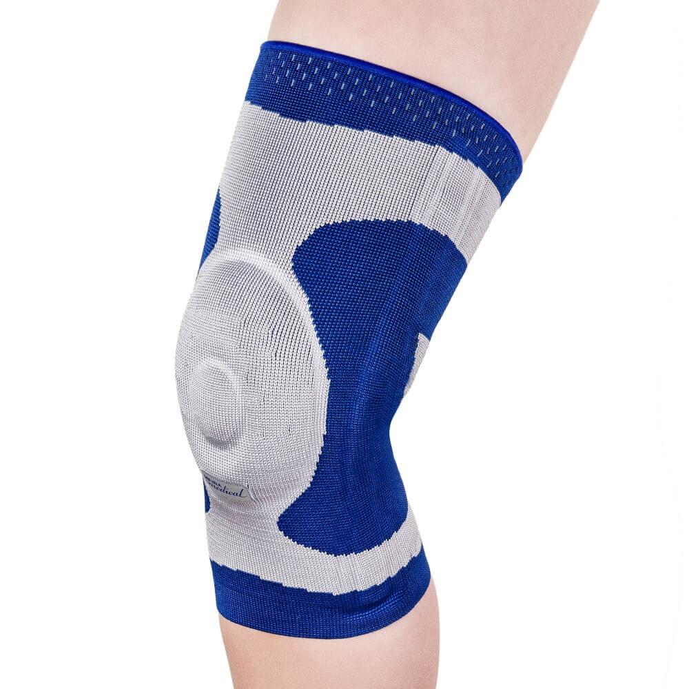 Kolenní bandáž s patelárním silikonovým kroužkem a bočními pružnými výztuhami.