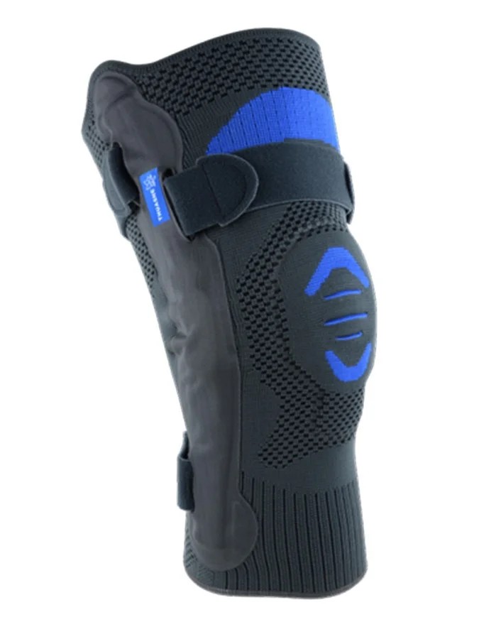 Kolenní ortéza s odnímatelnými dlahami s dvouosým kloubem a s hyperextenzní zarážkou.