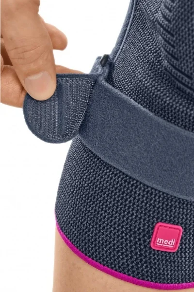 Široká silikonová patelární 3D pelota poskytuje znatelnou úlevu od tlaku na čéšku. Mimořádně měkká pletenina a komfortní zóna v zákolení s vroubkovitou strukturou zajišťují, že se ortéza velmi pohodlně nosí a snadno nasazuje. Díky jedinečné technologii pletení (medi Soft Edge) se ortéza nezařezává do kůže. Boční úchopové výstupky dále usnadňují nasazování ortézy.