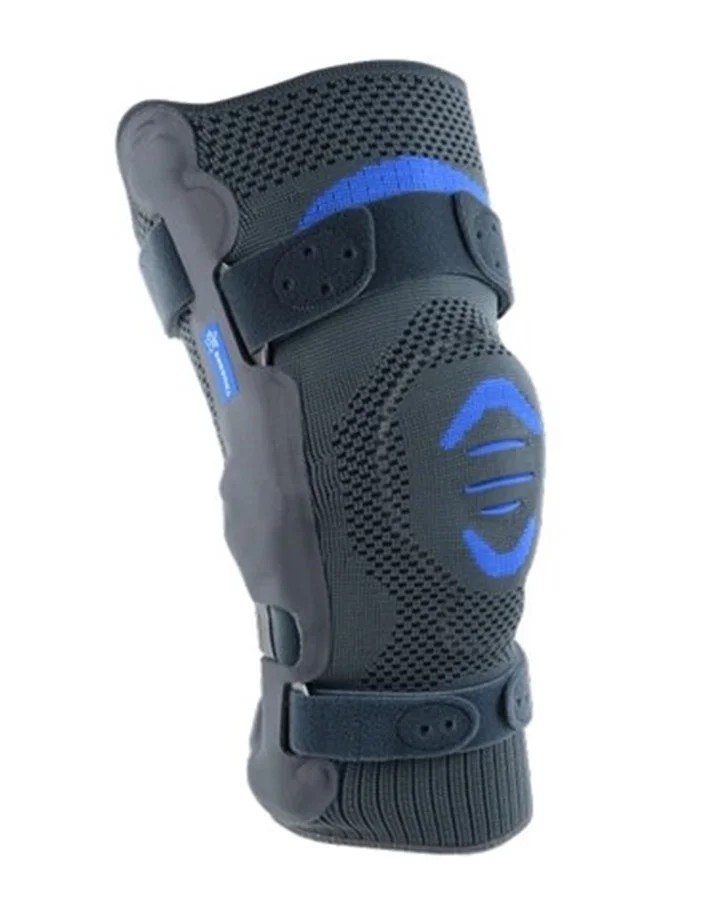 Kolenní vazová ortéza opatřená bočními kloubovými výztuhami zajišťujícími stabilitu kolene.