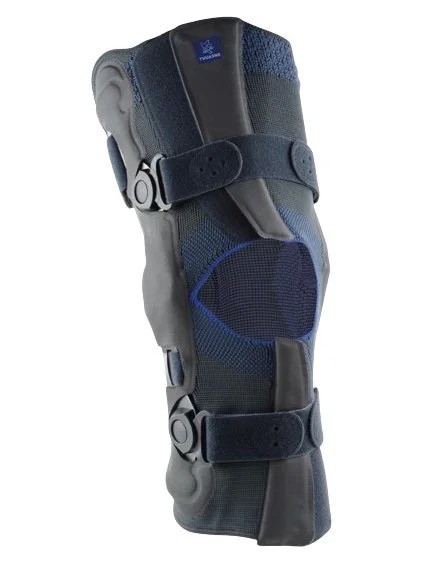 Kolenní vazová ortéza opatřená bočními kloubovými výztuhami zajišťujícími stabilitu kolene.