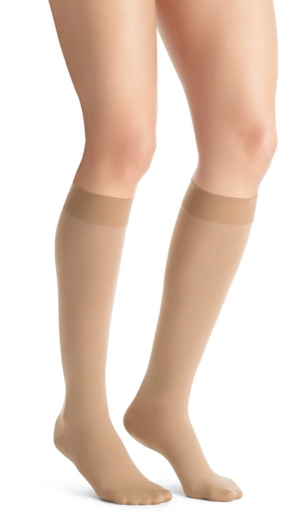 Neprůhledné kompresní lýtkové punčochy JOBST Opaque se špicí pro osoby se žilními problémy.