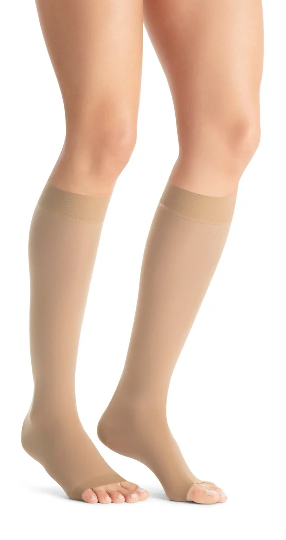 Průhledné prodyšné kompresní lýtkové punčochy JOBST Ultra Sheer bez špice pro ženy se žilními problémy.