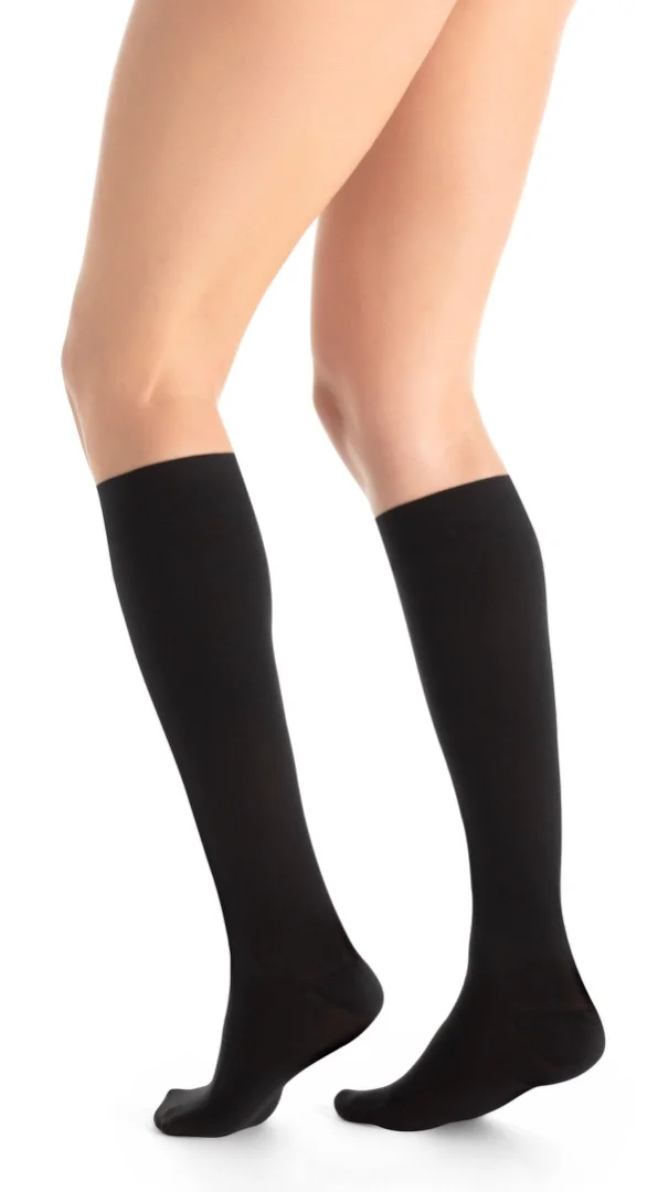 Průhledné prodyšné kompresní lýtkové punčochy JOBST Ultra Sheer se špicí pro ženy se žilními problémy.