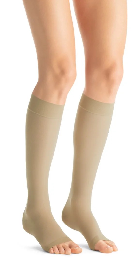 Průhledné prodyšné kompresní lýtkové punčochy JOBST Ultra Sheer bez špice pro ženy se žilními problémy.
