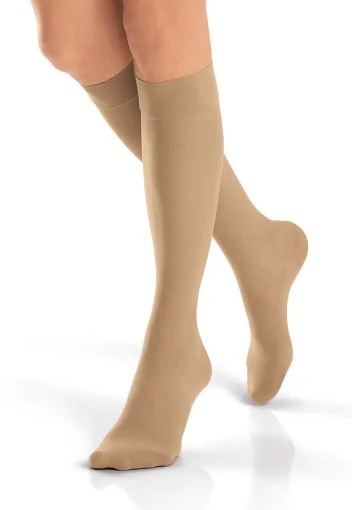 Průhledné prodyšné kompresní lýtkové punčochy JOBST Ultra Sheer se špicí pro ženy se žilními problémy.