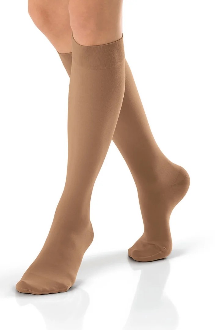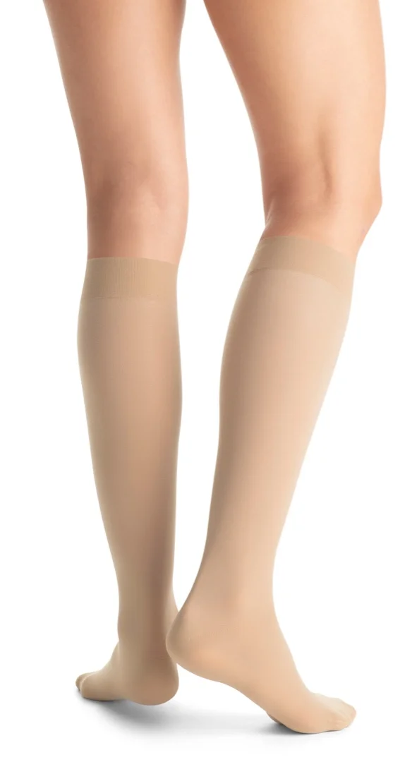 Průhledné prodyšné kompresní lýtkové punčochy JOBST Ultra Sheer se špicí pro ženy se žilními problémy.