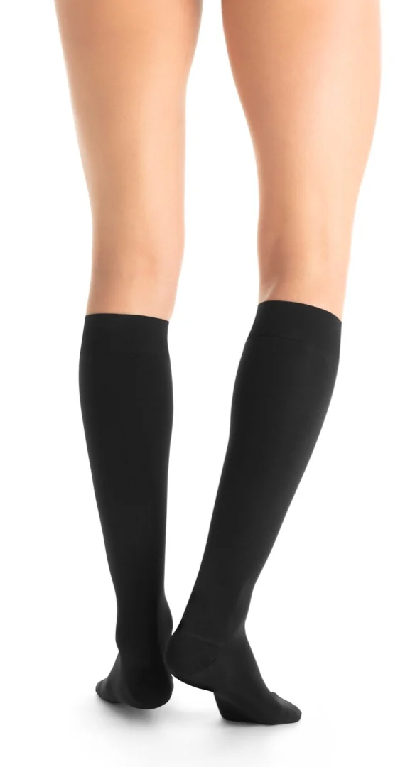Průhledné prodyšné kompresní lýtkové punčochy JOBST Ultra Sheer se špicí pro ženy se žilními problémy.