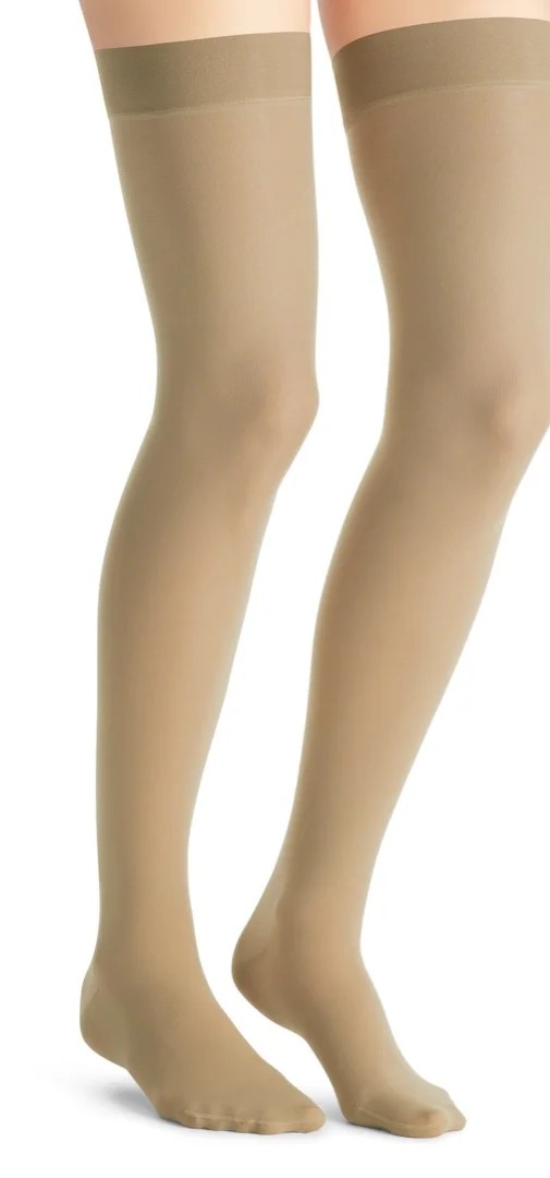 Průhledné prodyšné kompresní stehenní punčochy JOBST Ultra Sheer se špicí pro ženy se žilními problémy.